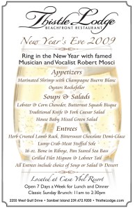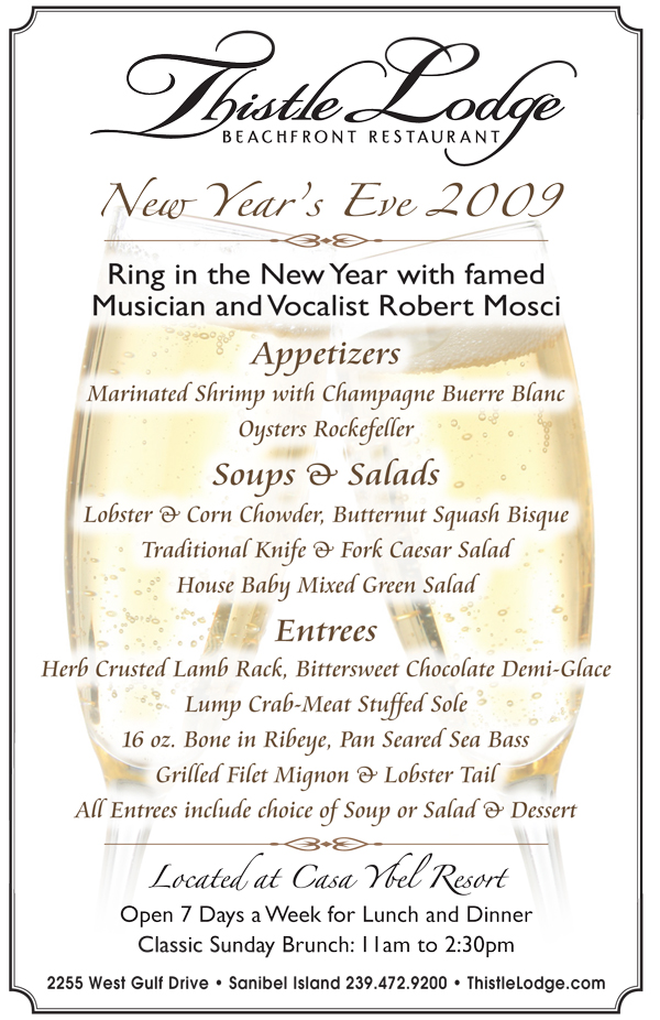With his flair for the pop standards, New York singer and musician, Robert Mosci, will be returning to Sanibel Island on December 31, 2009 at Casa Ybel’s Thistle Lodge Beachfront Restaurant for a special New Year’s Eve that promises to welcome in 2010 in style.
