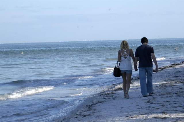 Pittsburgh residents Jeremy Rosen and Susan Crouch walk along the beach on Sanibel Island on Tuesday. They said the island is one of their favorite vacation spots because it is peaceful. / Dennis Culver/news-press.com