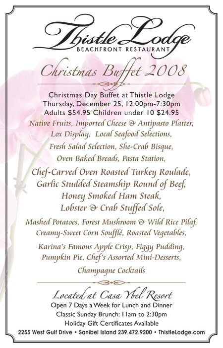 Thistle Lodge at Casa Ybel Resort, Sanibel Island is pleased to present their Christmas Buffet on Thursday, December 25, 2008 from 12:00 p.m. to 7:30 p.m.